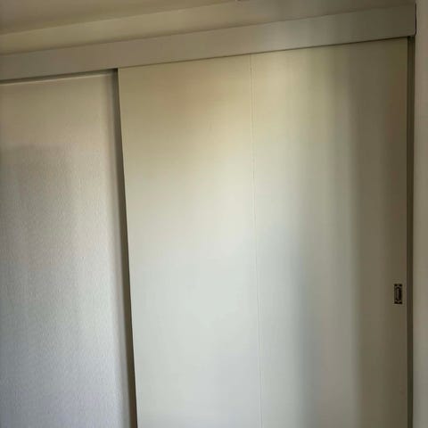 Skydedør i hvid med tilhørende skinnesystem til montering i loft. Der er to døre som kan forskydes uafhængigt af hinanden. Egnet til brug som rumdeler eller garderobedør, hvor der ønskes en skydedør.