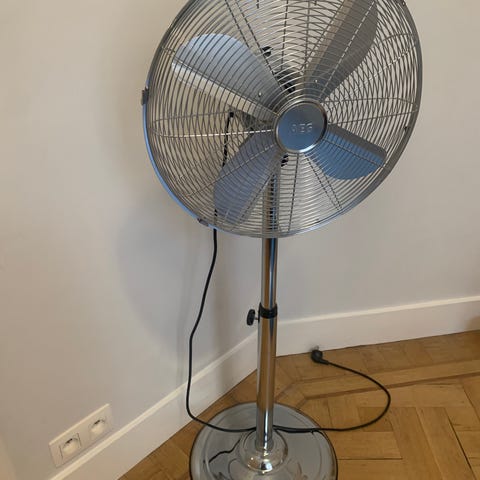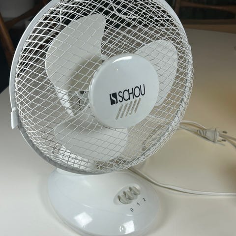 Schou elektrisk ventilator i sølvfarvet plast med sort frontgitter. Enheden har indbygget blæser, tænd/sluk-knap og netledning til strømtilslutning. Velegnet til brug indendørs, f.eks. til ventilation eller luftcirkulation på bord eller anden plan overflade.