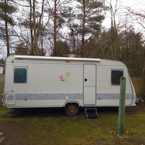 Fin lille ældre vogn indrettet med fast seng og ny madres, der kan også redes op til en seng mere, alt fungerer, fortelt og registreringsattest medfølger. Egen vægt 725 kg og totalvægt 900 kg tlf 60222546