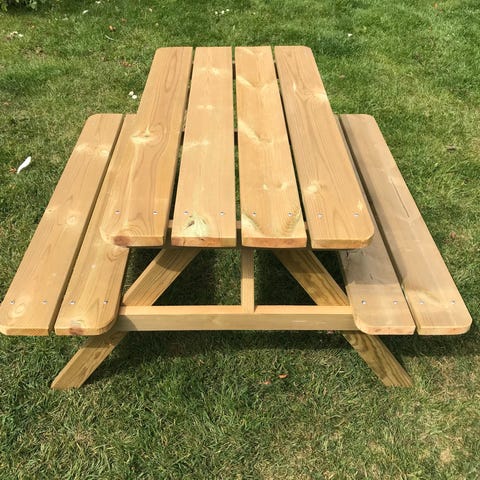 IKEA bænkbord i træ til udendørs brug. Bord og bænke er samlet i én konstruktion med plads til flere personer på hver side. Fremstillet i træ med naturlig overflade, egnet til terrasse, have eller altan. Velegnet som spisebord eller arbejdsbord i udemiljøer.
