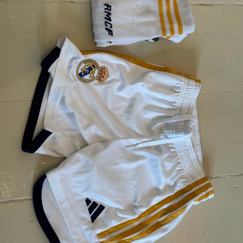 Adidas Real Madrid fodboldshorts i børnestørrelse 164. Shortsene er sort med kontraststriber i siderne og Real Madrid-klublogo på det ene ben samt Adidas-logo på det andet. Elastisk talje med snøre for justerbar pasform. Velegnet til fodbold og anden sport eller som afslappet hverdagsbeklædning.