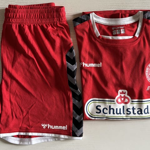Rigtig pæn rød sæt med hvid Hummel og DBU mærke og REMA 1000 på forstykket, på bagstykket Alfred 14.