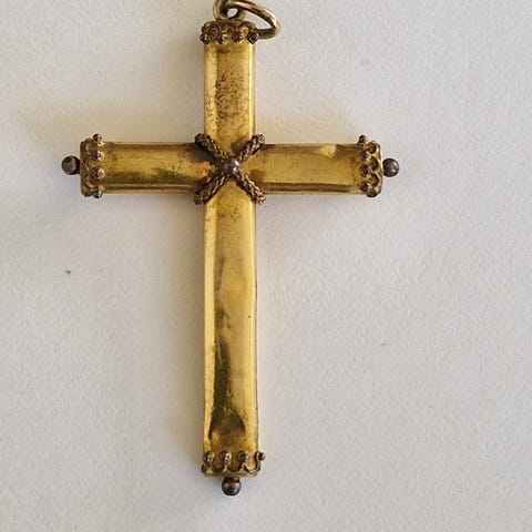 a) Anker af messing, - b) Medaljon: råbuk udskåret i hjortetak, - c) afrikansk maske, bronze, - d) Fatimas hånd, Marocco, ørkensølv, e) Kristus på korset, messing, afskruelig bundprop viser gemme til relikvie, splint af korset? - samlet salg foretrækkes, enkelt vis kan vel aftales