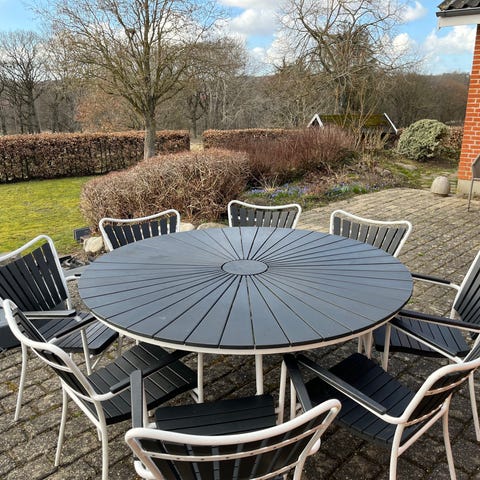 Rundt havebord ø 170 med tilhørende 8 stole. Bordet er rundt med lameller og har et centralt cirkelfelt. Stolene er i sort plast med grå hynder af mærket Outsider. På bordpladen ses enkelte mærker, som fremgår af billederne. Der medfølger lamel, så man kan udskifte den skadede. Møblerne står i Pøt Strandby ved Juelsminde.