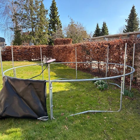 Berg trampolin i nedgravet, oval udgave med sort hoppeflade og grøn kantpude.