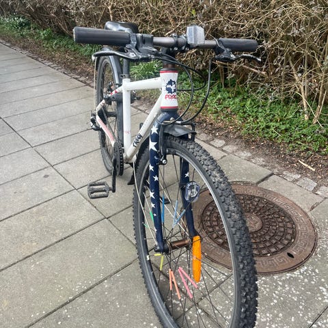 Frog 78 børnecykel med 26" hjul. Cyklen har sort stel med lige styr og gear bagpå. Udstyret med skærme, støtteben og flaskeholder. Sadlen er slidt, som det fremgår af billederne. Velegnet som hverdagscykel til større barn.