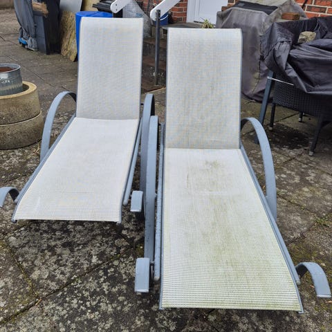Havestole / liggestole sæt i sort stof med metalstel. Sættet består af to liggestole med buede stel og integreret fodstøtte. Stolene har netstof i sæde og ryg samt aftagelige hovedpuder. Stellet er udført i rund metalprofil, og stolene kan klappes sammen for nem opbevaring. Velegnet til brug i have, på terrasse eller altan. Sælges samlet.