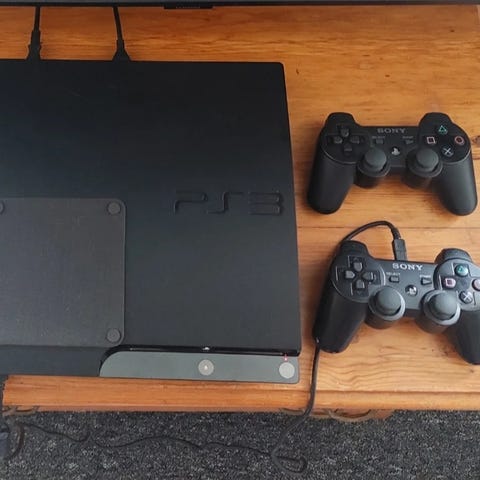 Sony Playstation 3 konsol med flere trådløse controllere og tilbehør.