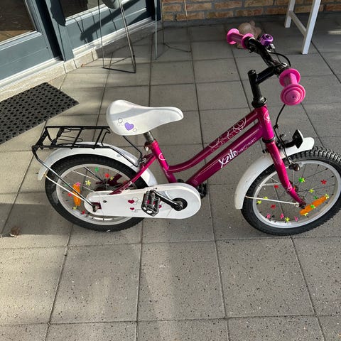 Børnecykel med 16" hjul i lilla og gul. Cyklen har lav indstigning, kurv foran og bagagebærer bagpå. Egnet til børn, der er 5/6 år gammel.