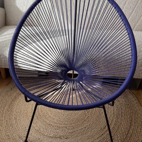 Stol loungestol i sort farve. Sædet består af sorte plastsnore spændt i et ovalt stel, som giver et åbent og let udtryk. Stellet er i metal med fire ben og tværstivere for stabilitet. Egnet som afslapningsstol i stue, udestue eller på overdækket altan/terrasse. Den fungerer som gyngestol
