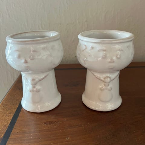 2 hvide potte hoveder 7 cm høje og 9,5 cm i diameter. Den ene en hårfin krakelering , se billede. Prisen er for begge to. Sender gerne men ikke med fiksfærdig