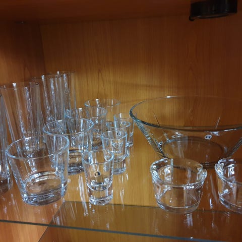 Rosendahl glassæt bestående af flere dele i klart glas. Sættet omfatter store og mindre serveringsskåle samt drikkeglas. De store skåle egner sig til servering af salat, frugt eller som serveringsfade, mens de mindre skåle kan bruges til dessert, snacks eller tilbehør. Drikkeglassene kan anvendes til vand, juice eller andre kolde og varme drikke. Alle dele er udført i klart glas, som passer ind i de fleste borddækninger. To Rosendahl fyrfadsstager samt to små og en lidt større holmegårds fyrfadsstager. Prisen for det hele samlet.