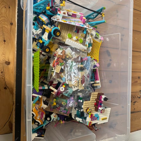 Kasse med mange forskellige Lego friends sæts. Blandt andet et krydstogtskib, rideskole, forlystelsespark.