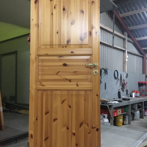 7 stk. Indvendig trædøre med klassiske fyldninger. En af dørene har glasfelter i den øverste del, opdelt i ruder. Velegnet til brug som indvendige døre i bolig, sommerhus eller lignende, hvor der ønskes et rustikt eller klassisk udtryk. Håndtag og beslag er monteret på dørene på billedet.