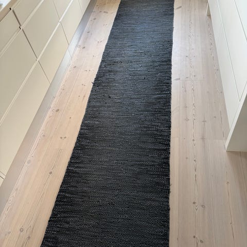 Rug Solid flettet læderløber i sort/grå nuancer. Løberen har flettet struktur med ruskindsender. Velegnet til gangarealer som entré, køkken.