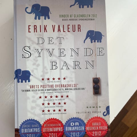 Erik Valeur Det syvende barn roman. Dansk skønlitterær bog i romanform. Forside med blå elefanter og hårdt omslag. Velegnet til læsere af danske samtidsromaner.
