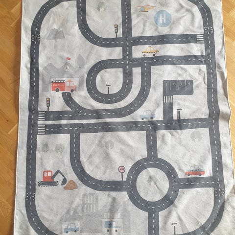 Porsche tæppe med motiv af røde sportsbiler og bilrelaterede logoer på lys baggrund. Tæppet egner sig til brug i børneværelse, legeområde eller som dekorativt indslag i et bilinteresseret miljø. Materiale og mål er ikke oplyst.