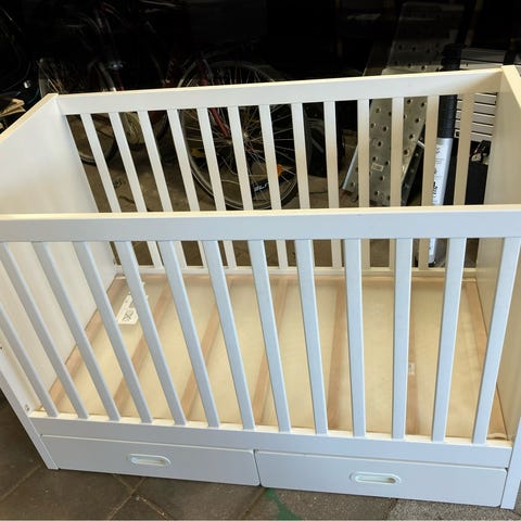 God tremmeseng med to skuffer. Den passer til en madras med målene 120x60 cm. Sengen har lidt skrammer hist og her og lidt misfarvning på toppen af begge endesider, men fejler absolut ingenting.