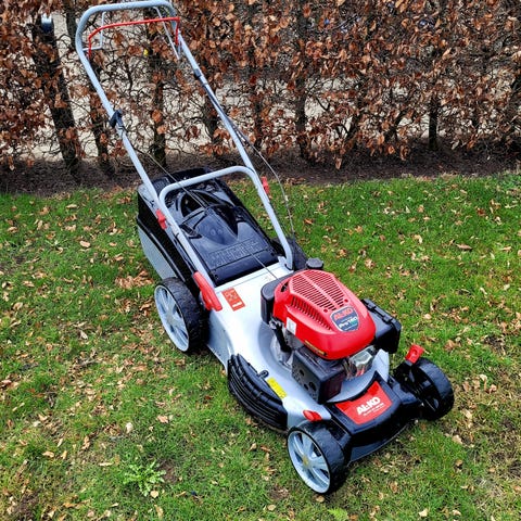 Fremtræk på forhjul som virker som det skal. Alle hjul har fået lidt smørefedt. Stor opsamler bagpå, samt kan den også køre bioklip. Kniv nyslebet, 53 cm klippebredde. Årgang 2013.