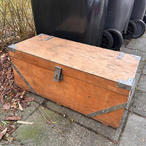 Trækasser med metalforstærkninger og taltryk