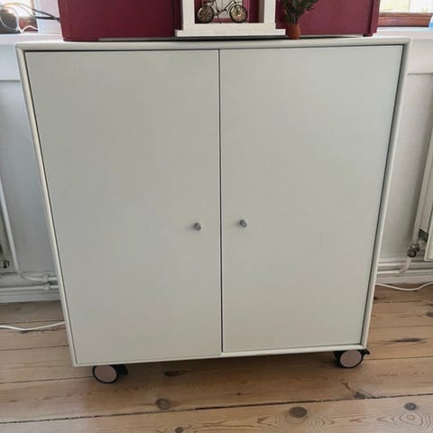 Montana skab/kommode i gul farve med en hylde. Vi har brugt den til sengebord med med ophæng kan den bruges som vægskab mm.