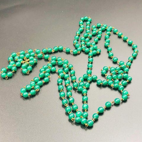Med 5 kæder hvor den korteste er 39 cm. Lyseblå glas el. stenperler og kunstige perler. Lås og kæder er i gyldent metal