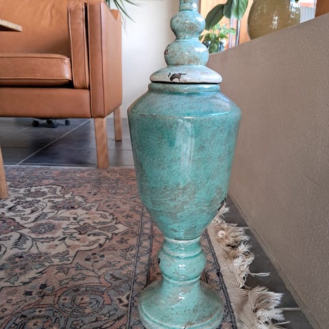 Ilva krukke i stor størrelse i en mørkegrå farve med rustikt, patineret udtryk. Formen er rund med smal bund, bred midte og indsnævret åbning foroven. Krukken kan anvendes som dekorationsgenstand i hjemmet, eksempelvis i stue, entré eller på overdækkede udendørsarealer. Velegnet til tørre grene, kunstige planter eller som fritstående dekoration.