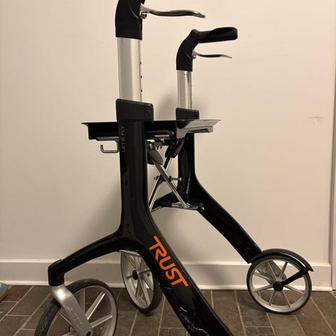 Flot rød Trust Rolator model (lets fly) meget lidt brugt , se hjemmeside Seniorland , meget lidt brugt , let at klappe sammen , let aftagelig taske med lommer udv og indv med lynlås , sæde , ingen synlige kabler , der kan tilkøbes div udstyr , ny pris