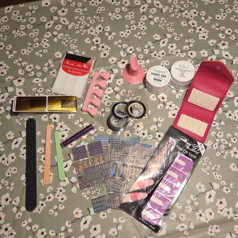 Samlingssæt til negle bestående af UV/LED lamper, flere bokse med gel-lakker i forskellige farver samt diverse neglefilere, buffere og nail art-tilbehør. Sættet indeholder blandt andet farvede gel-lakker, dekorationssten, tape, pensel og andre redskaber til manicure og negledesign i hjemmet eller i mindre neglesalon. Antallet af enkelte dele fremgår ikke præcist af billederne, men der er mange forskellige nuancer og typer af produkter samlet i én pakke.