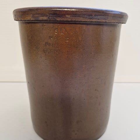 stentøjs syltekrukke i brunlig glasur. Krukken har hank i hver side og glaseret inderside. Egnet som opbevaring af mad. Rummer 2 liter, 18 cm høj og 15 cm i diameter. Eller som dekorativ krukke I hjemmet fra dyre og røgfrit hjem. Jeg sender på købers.