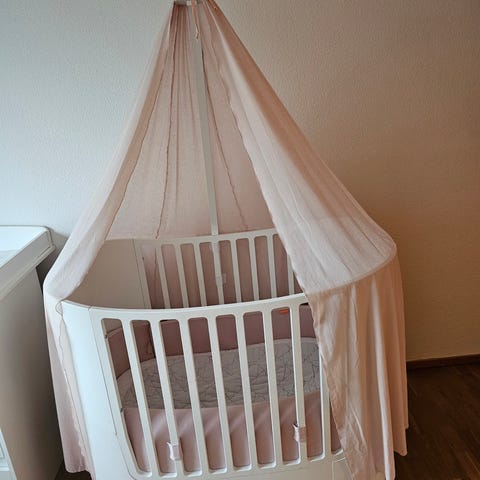 Leander baby/tremmeseng m. Udbygning til junior seng m. Sengehest. M. Madras. Kan bruges fra nyfødt til 6-7 år.