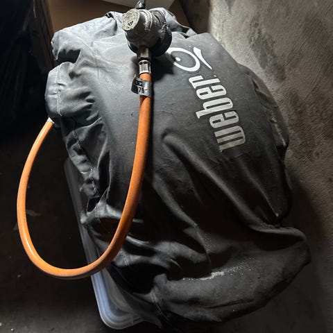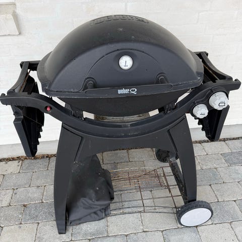 Med velholdt Weber gasgrill i sort med låg og integreret termometer. Grillen har et side bord. Underskab med opbevaringsplads samt hjul for nemmere flytning. Tilsluttes gasflaske via medfølgende gasslange og regulator, er smeltet lidt i plastikken, men er ikke udtær. Velegnet til udendørs madlavning i have eller på terrasse. Der medfølger er rotisserie også fra Weber 8510. Trænger til et nyt cover.