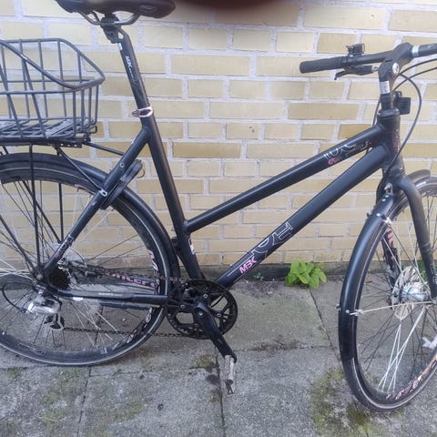 MBK hybridcykel med 53 cm stel. Cyklen har lav indstigning og lige styr. Der er monteret bagagebærer. Håndbremse og fodbremse. Gear der virker på nogle af niveauerne, ikke alle. Fungere fint til stations cykel.