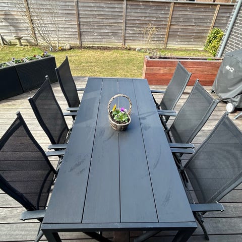 Trænger til en gevaldig rengøring. Hynderne er bleget af solen. Der er nogle pletter på bordet som ikke er forsøgt taget af. Se sidste billede