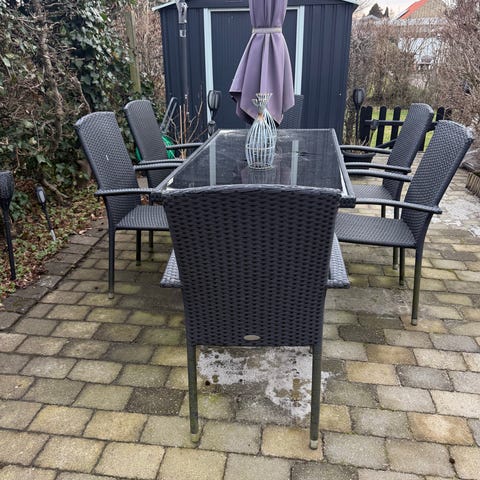 Sort havebord i polyrattan og glasplade samt 6 stole med hynder.