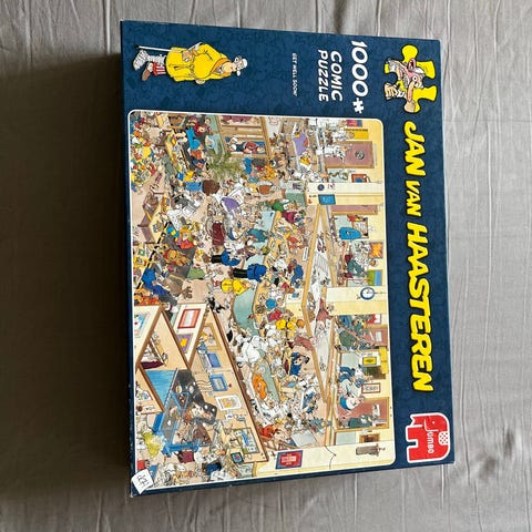 Jumbo Jan van Haasteren puslespil med 1000 brikker. Motivet er en humoristisk og detaljeret tegneseriescene i bymiljø. Egnet til puslespilsentusiaster, som kan lide farverige og komplekse motiver med mange små detaljer. Velegnet til indendørs hyggeaktiviteter for unge og voksne.