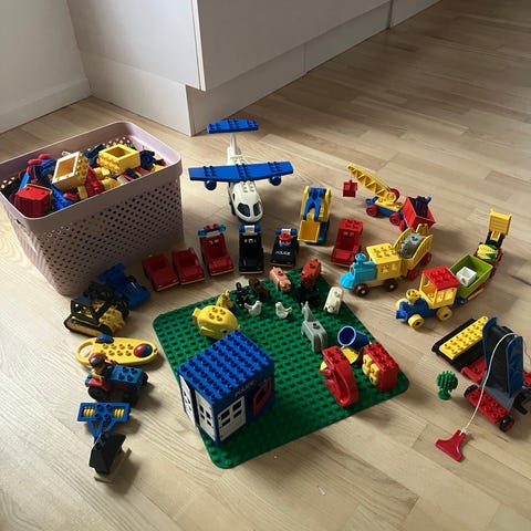 Lego Duplo klodser i blandede farver og former. Sættet indeholder forskellige typer byggeklodser samt enkelte specialdele som hjul, vinduer og plader. Velegnet til leg og byggeri for mindre børn, hvor der kan bygges simple figurer, køretøjer og konstruktioner.