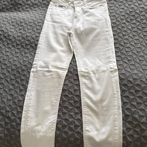Marc Lauge jeans til dame i hvid denim med stræk. Bukserne er i størrelse 34 med taljemål W27. Klassisk femlommers model med bæltestropper og lynlås- og knaplukning. Velegnet som hverdagsbukser eller til mere afslappede anledninger.