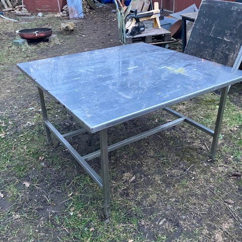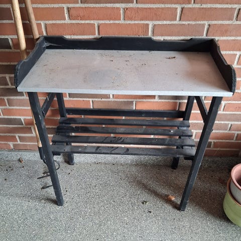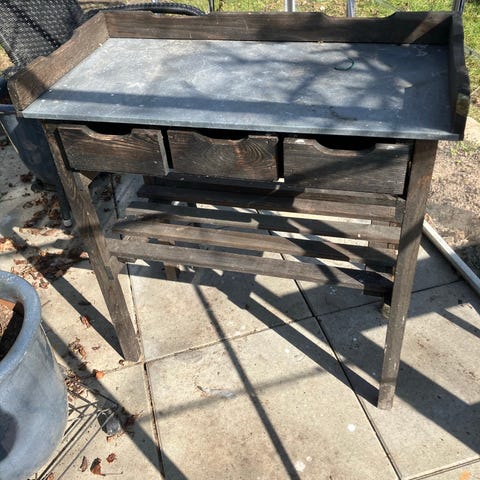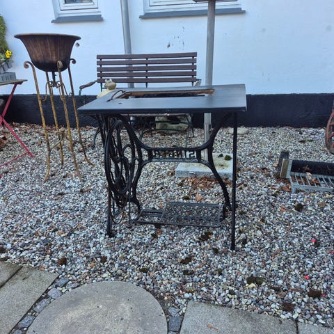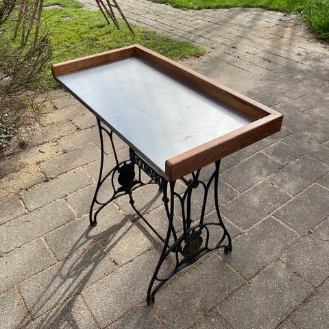 Plantebord Singer bord med metalplade og træramme. Bordet er opbygget af et originalt Singer symaskinestel i sortmalet metal og en rektangulær bordplade med lys metaloverflade og kantliste i træ. Stellet har de karakteristiske Singer detaljer og fungerer som stabil base for bordpladen. Velegnet som sidebord, plantebord eller lille arbejdsbord i fx udestue, køkken eller værksted. måler 70cm x40cm h 78 cm