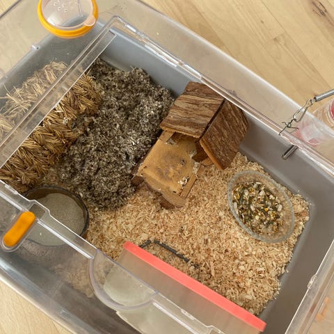 Hamster bur med tilbehør. Buret består af glasbund med tråd-overdel og flere niveauer med træhylder. Der medfølger blandt andet løbehjul, vandflaske, sandbad, tunnel, to hamsterhuse og foder-/strøelse som vist på billederne. Egnet til hold af hamster i indendørs miljø. Buret giver mulighed for dyb bund med strøelse, så dyret kan grave og gemme sig, samt flere etager til aktivitet og bevægelse.