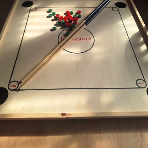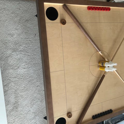 GLS Boss carrombræt i træ. Spillepladen har lys træfarve med trykte markeringer og mørke hjørner med huller til scoring. Velegnet til carromspil i hjemmet eller til fritidsbrug. Brættet placeres på bord eller gulv under spil.