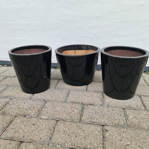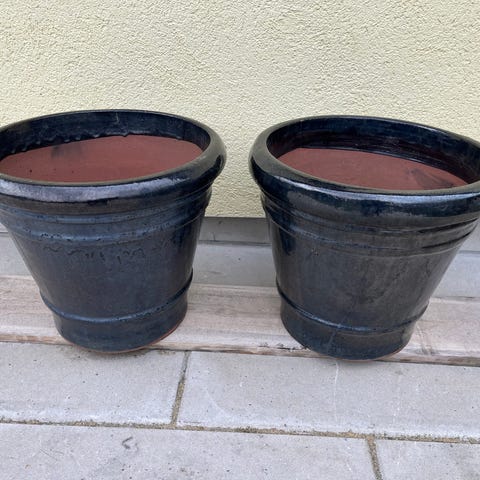 Sæt med to havekrukker i grøn keramik. Krukkerne er dekoreret med mønster på ydersiden og har drænhuller i bunden, som gør dem egnede til udendørs beplantning.