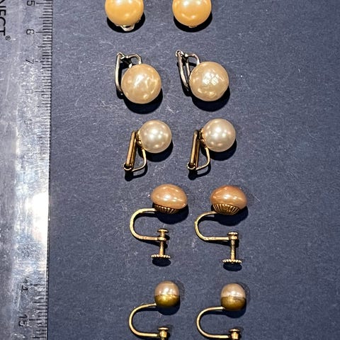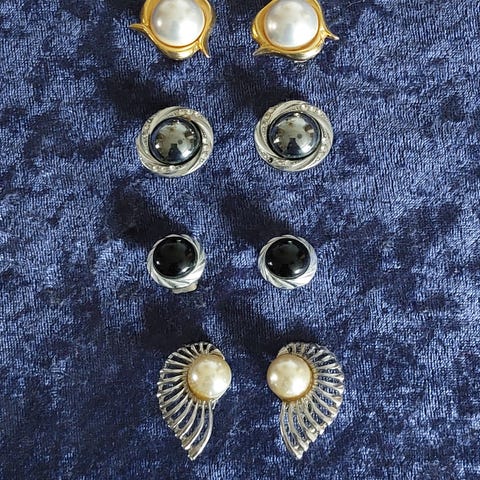 De øverste er sorte (nok blodsten) med en sølvfarvet indfatning. De øvrige er guldfarvede.