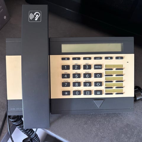 Modellen har håndsæt med spiralledning og mekanisk ringesignalknap på siden.