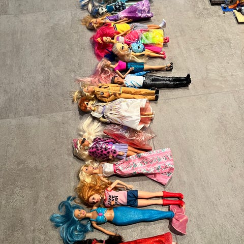 Blandede Barbie dukker med forskelligt tøj og småting, som ses på billederne.