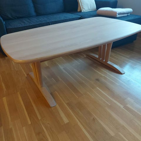 Træ sofabord i rektangulær form med afrundede hjørner. Bordet er udført i lyst træ med synlig årestruktur og står på fire lige ben med tværstiver for ekstra stabilitet. Velegnet som sofabord i stue eller opholdsrum, hvor der er behov for en enkel og funktionel bordløsning foran sofaen.