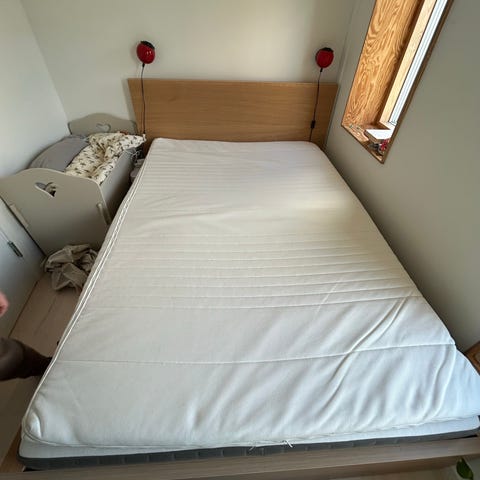 IKEA MALM seng med opbevaring og VÅGSTRANDA springmadras 140x200 cm. Sengen er i hvid og har integrerede skuffer under sengerammen til ekstra opbevaring. Madrassen er en VÅGSTRANDA springmadras med pocketfjedre i størrelsen 140x200 cm, med lys overdel og lyseblå sider. Velegnet som dobbeltseng i soveværelse eller gæsteværelse.