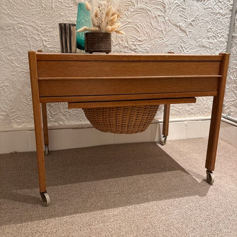 Fleksibelt vintage rullebord/sengebord. Kan justeres i højden og den lille sidedel kan slås ned.