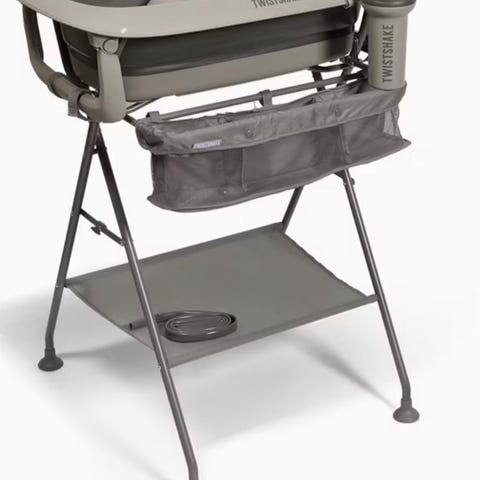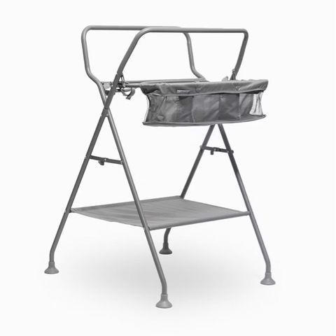 Stel til Twistshake babybad i grå metal. Stellet har opbevaringskurv i stof på siden samt hylde nederst til ekstra opbevaring.