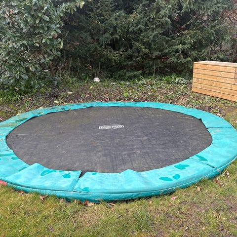Diameter på 430 meter- så det er en stor Berg trampolin med sikkerhedsnet og stige i grøn. Rund havetrampolin med polstret kantpude og net hele vejen rundt for øget sikkerhed. Leveres med stige for nem adgang. Velegnet til udendørs brug i haven.